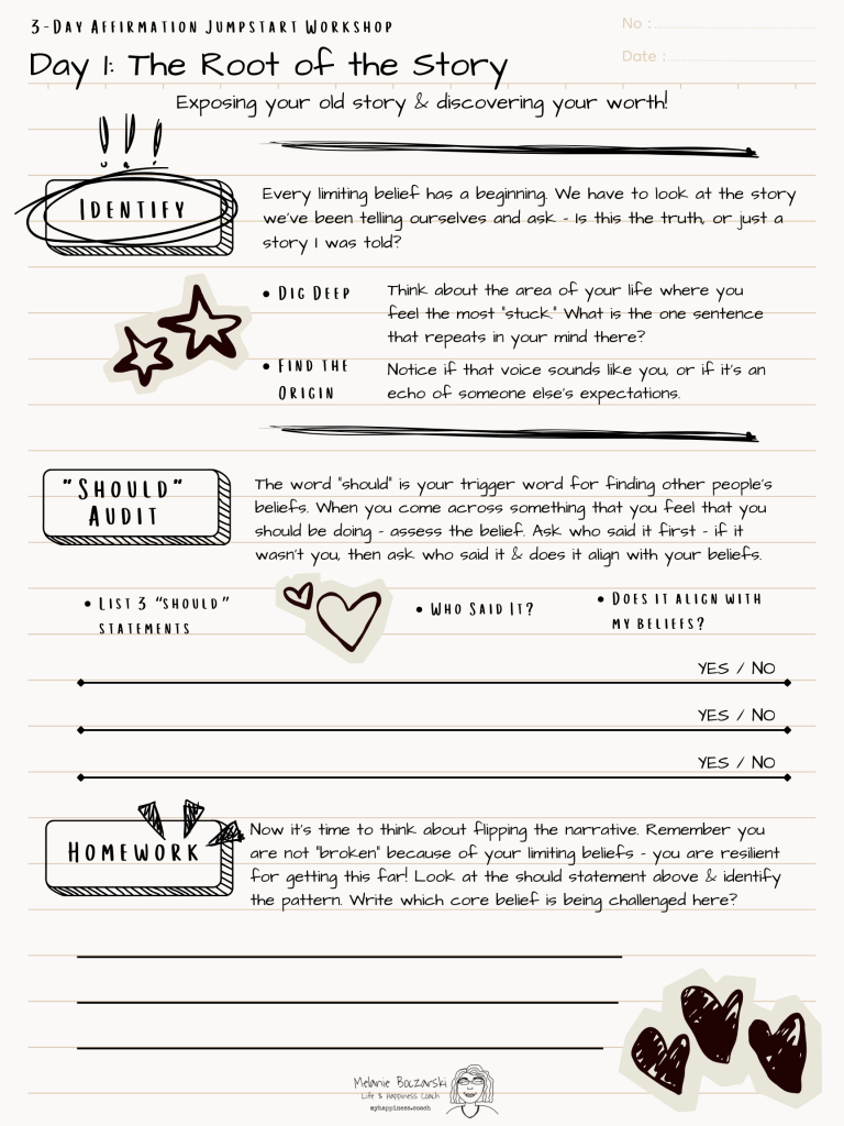 Perform a Should Audit – identify 3 persistent negative thoughts & find the Core Belief that those thoughts are trying to prove. Use the worksheet below to decide which thoughts stay & which belief you want to flip during this workshop.